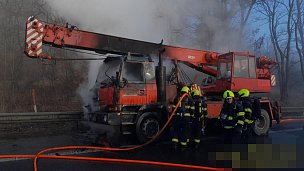 Za výjezdem z Prahy po strakonické silnici č. 4 poblíž vysílače Cukrák likvidují hasiči požár autojeřábu. Na místě zasahují profesionální hasiči z Řevnic společně s pražskými kolegy z Radotína.