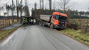Krátce před polednem vyjeli hasiči do Lán k nehodě nákladního automobilu, při které došlo k převržení vleku, vysypání nákladu (štěrku) na vozovku a zablokování silnice z Lán do Křivoklátu. Událost se obešla bez zranění.